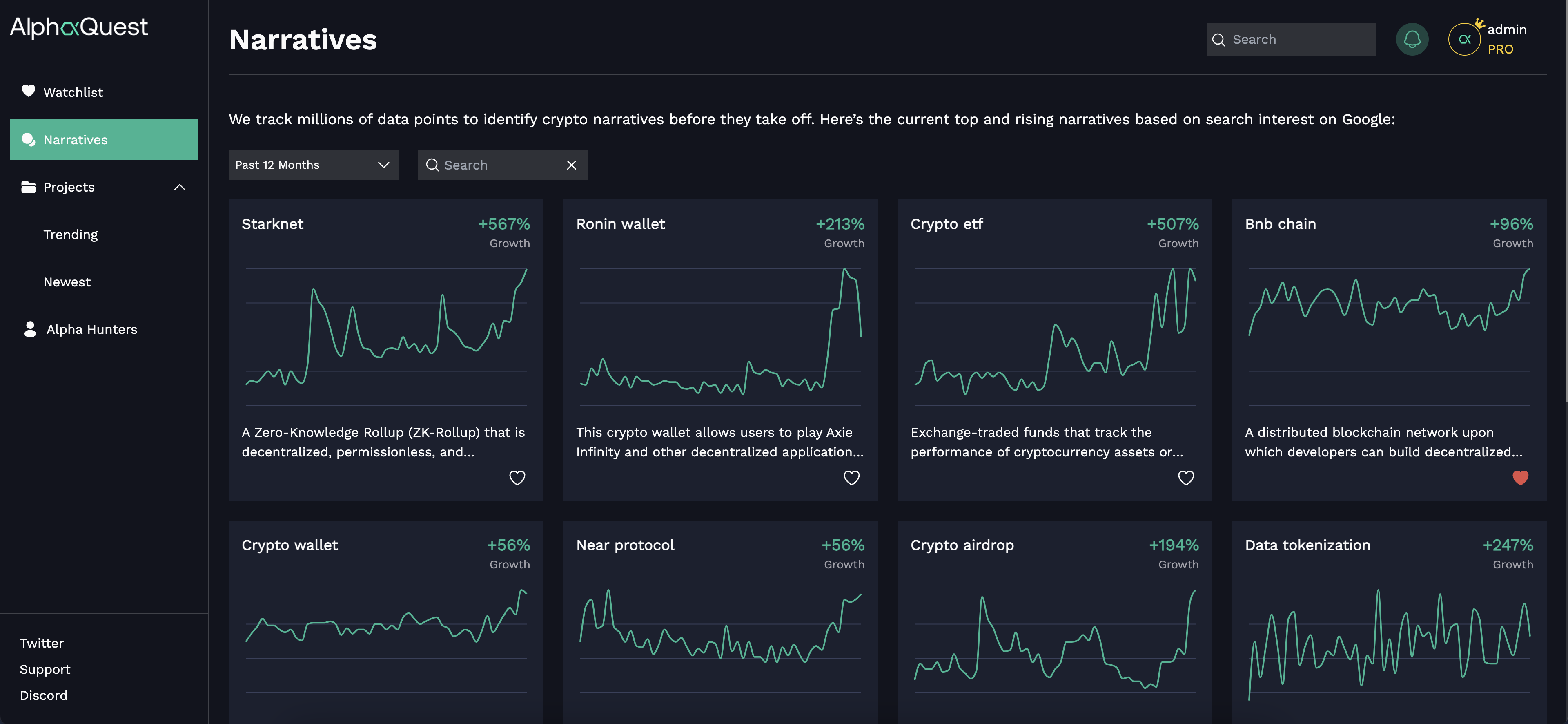 <figure><img src="https://3168316341-files.gitbook.io/~/files/v0/b/gitbook-x-prod.appspot.com/o/spaces%2F5CZln2X9mlHVQsEnepwj%2Fuploads%2Ft2NpsIrMpGNOVPXPpyGY%2FCleanShot%202023-12-21%20at%2013.16.23%402x.png?alt=media&#x26;token=111eeec7-cd31-46a7-b9f2-e1560a5206a7" alt=""><figcaption><p><a href="https://alphaquest.io/narratives">https://alphaquest.io/narratives</a></p></figcaption></figure>